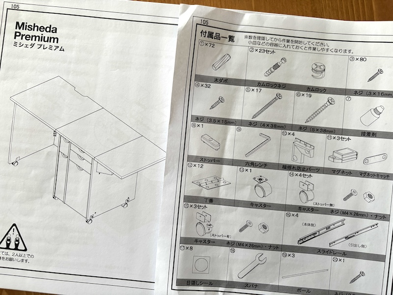 今回組み立てたのは、幅150センチ、引き出し3段折りたたみ式の大型ミシン台。
