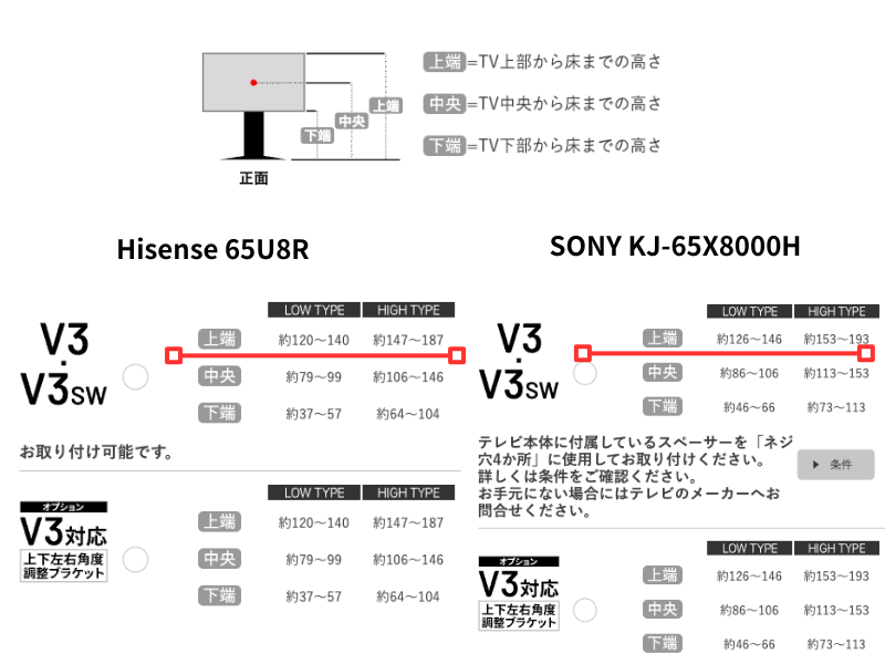 取り付けてみて分かったのですが、現在使用しているWallのテレビスタンド V3にハイセンスの65型を取り付けたところ、今までのSONY 65型と比較するとテレビ上端(TV上部から床までの高さ)が、ハイセンスの方が約6センチほど低く設置されることがわかりました。